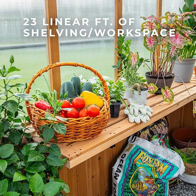 - Spacious Interior: 86 square feet of interior space with a built-in workstation offers 23 linear feet of foldable and fixed staging shelves to suit your gardening needs