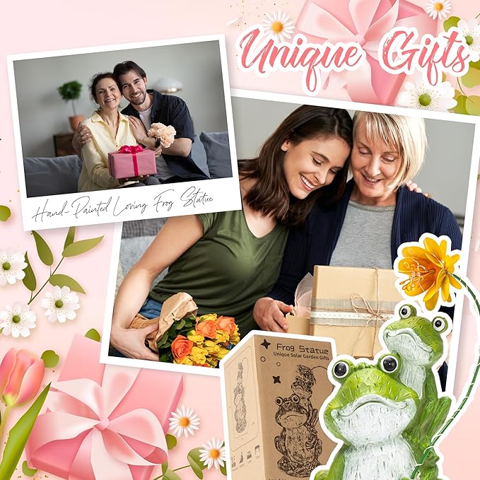 - Unique Design: This garden sculpture celebrates the mother-child connection through a mother frog holding a flower stem with her baby on her back, topped by a blooming flower. By day, it's a lovely display; by night, the solar-powered flower illuminates