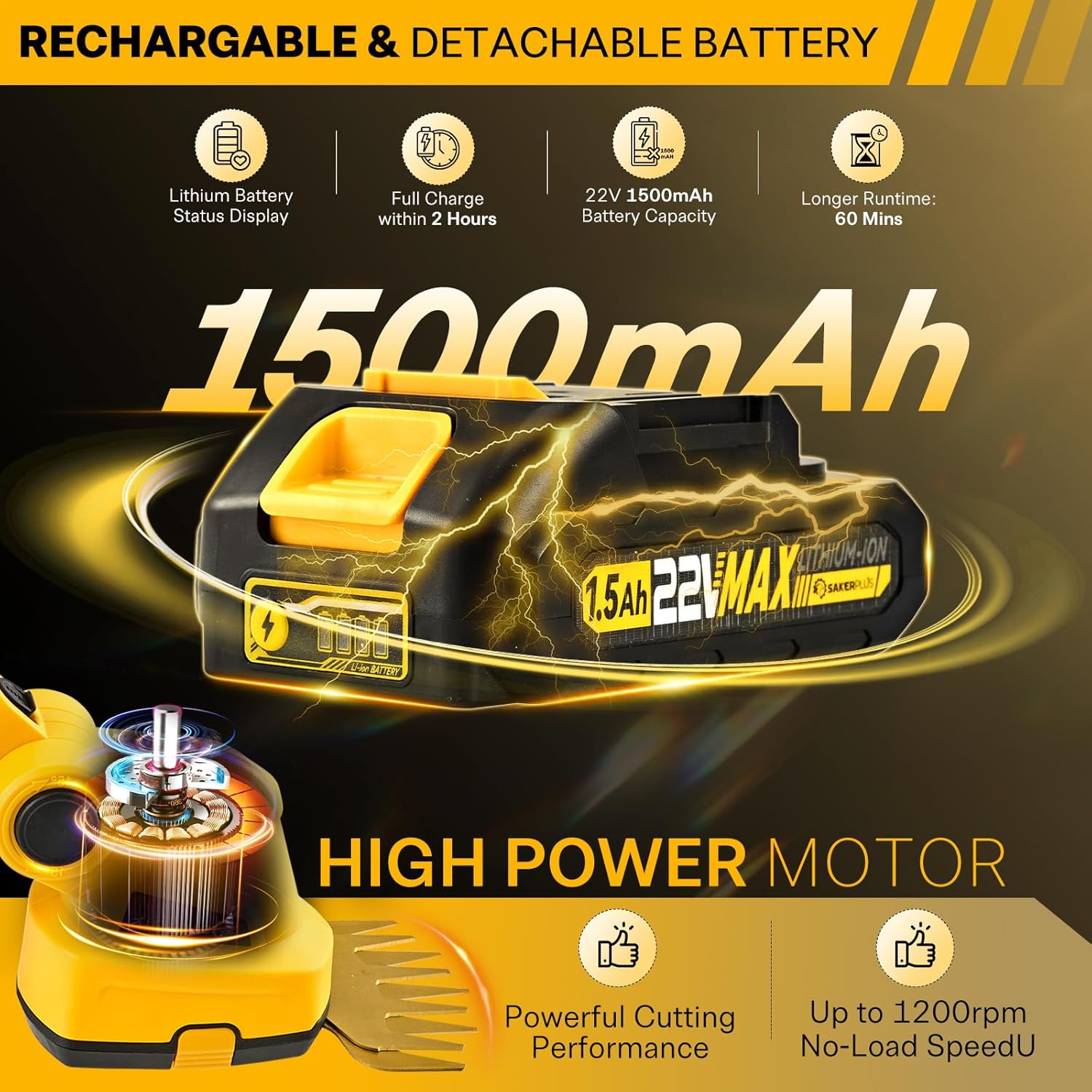 - 【RECHARGEABLE BATTERY WITH INDICATION】SakerPlus hand held hedge trimmer is powered by a rechargeable and detachable lithium battery (20V 1500mAh), providing hassle-free operation. Fully charged in 2 hours, it offers approximately 60 minutes of working time, allowing you to work anywhere without the constraints of electrical outlets or extension cords. Monitor the battery level to ensure sakerplus grass shear has ample power to complete your gardening or pruning tasks without interruptions.