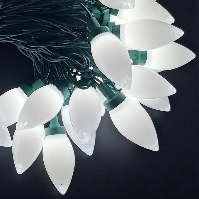 - [Warm Decoration] C9 Christmas lights can be used outdoor and indoor. It's a very nice Christmas decoration, can be used as Christmas Tree, Balcony, Bedroom, Patio, Garden, Holiday, Party. Light up cool white c9 lights, LED light through the c9 smooth bulb, the light is soft and fairy, very beautiful. LED lights are low heat generate, bring you a relax.