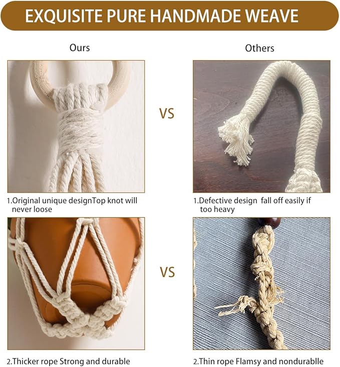 - HANDMADE WEAVING CRAFT - Hanging plant holder made from eco-friendly cotton rope and woodedl ring, It has a strong flexible woven design, sturdy and durable, enough to hold the weight of the pots, not easy to break, you can take them home for your plants with confidence