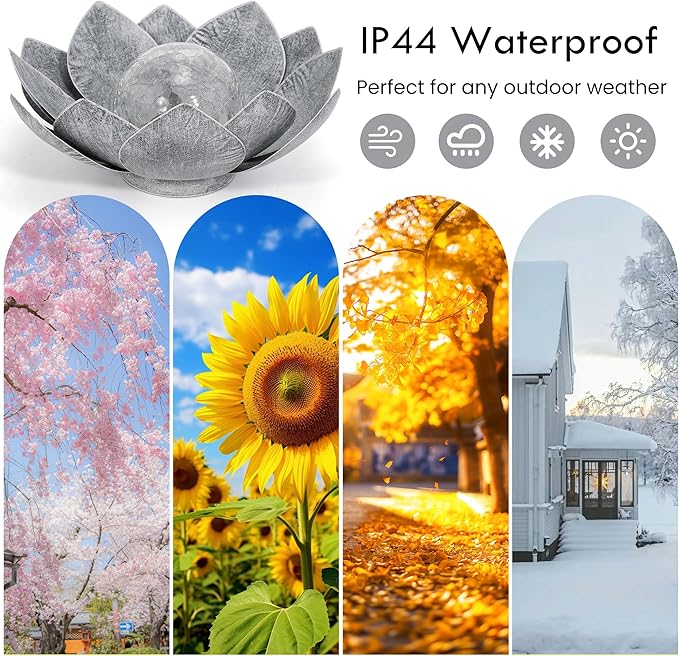 - 【Larger Capacity & Waterproof Lotus Solar Lights for Outside】: Our garden solar lights outdoor waterproof are solar powered, these lights can be completely placed in your outdoor area. Built-in high-quality 1.2 V Ni-MH AAA 600MAH battery. When the battery is fully charged in full sunlight, the decorative lights will be on for 6 to 8hours at night,The IPX4 waterproof rating ensures that outdoor solar lights can withstand all kinds of harsh climates.We've effectively addressed the issue of short lighting duration on cloudy days, ensuring that the light remains bright even during overcast weather.
