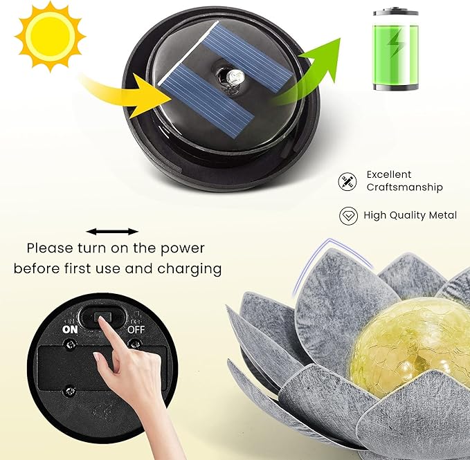 - 【Easy installation】: This Metal Yard Art Outdoor Solar Garden Lights Waterproof is incredibly easy to install, no manual needed. It's so user-friendly that even seniors and kids can set it up effortlessly. To activate the Metal Lotus Outdoor Solar Garden Decorative Light, simply switch it to the ON position and place it in a sunlit area to harness solar energy. The solar light will illuminate for up to 8 hours at night, providing flexible placement options for decorative arrangements.