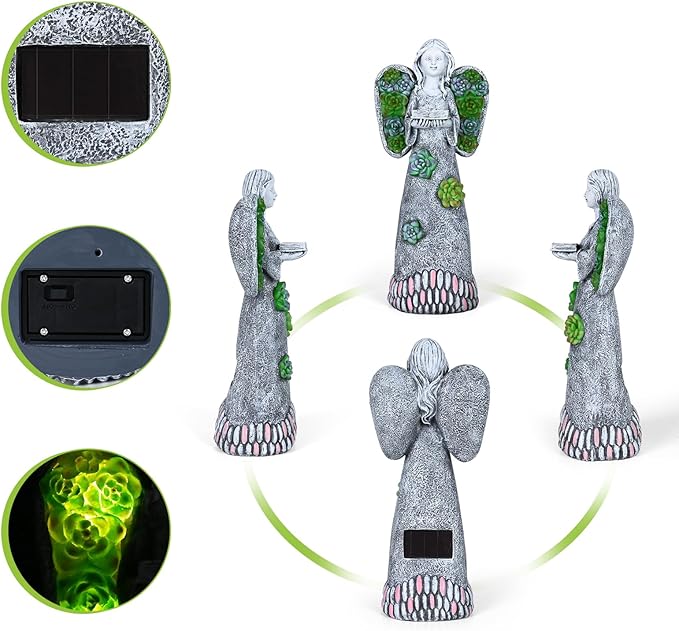 - 💎High-Quality Materials: Every parts of the garden angel is made of long-lasting resin and able to withstand,90cm crash-proof tested. Don’t worry about breaking when shipping. All resins, paints, and packaging used have been tested to conform with current U.S safety regulations. Pack Measures: 4.5"L x 3.3"W x 10.24"H.