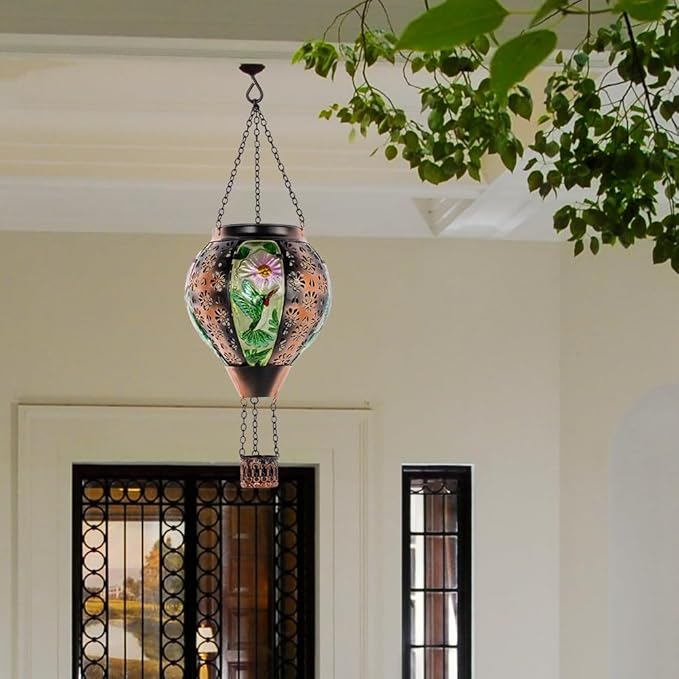 DREAMSOUL Hummingbird Hot Air Balloon Solar Lantern, Metal & Glass Flickering Flame Light Solar Lantern, Hanging Waterproof Solar Lanterns Outdoor for Garden Patio Tree Decoration Christmas Gifts