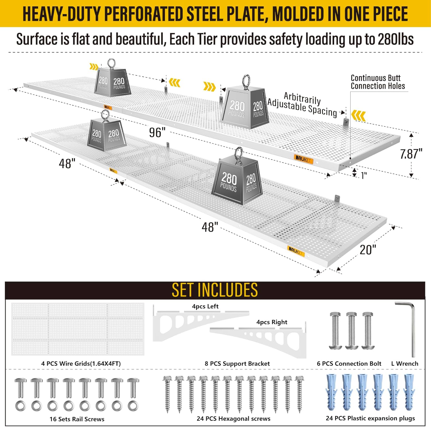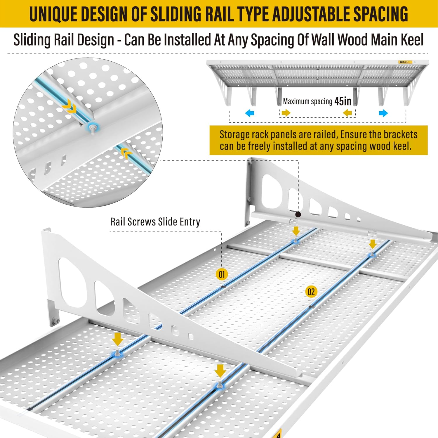 - SUPERIOR DESIGN: Wall shelf garage storage rack panel is made of whole piece of perforated steel plate bending and welding, the surface of matte high temperature powder baking paint, flat and smooth; the panel adopts slide rail design, can be adjusted by parallel left and right sliding at will; bracket can be freely installed in 45โ range of the spacing of the wood wall keel, without affecting the precision connection with the panel, eliminating the worry of being unable to docking due to the mismatch of spacing points of load-bearing wood wall keel or inaccuracy of the installation of the bracket. It saves time and labor