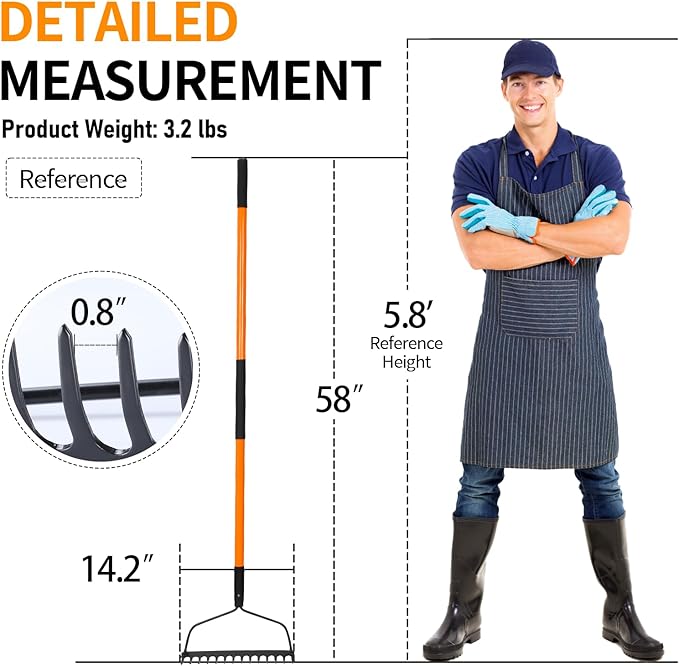 - Dimension: The 58 inches total length of the heavy duty metal rake is more suitable for adult use, and the right size reduces the pressure on the waist during use, and also improves the efficiency of long-term use.