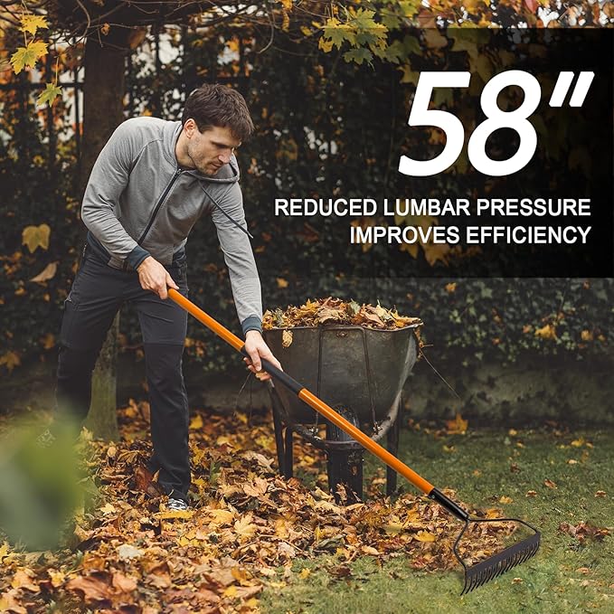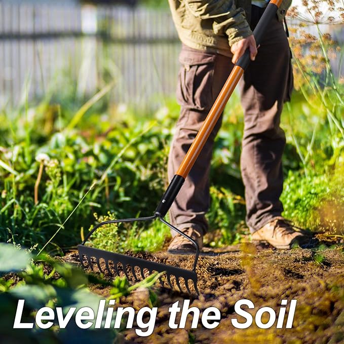 - Special Handle: The thick fiberglass handle is stronger and less likely to break and bend during prolonged or heavy use, the handle comes with 2 non-slip grips that provide a comfortable and firm grip when gardening with a lawn rake.