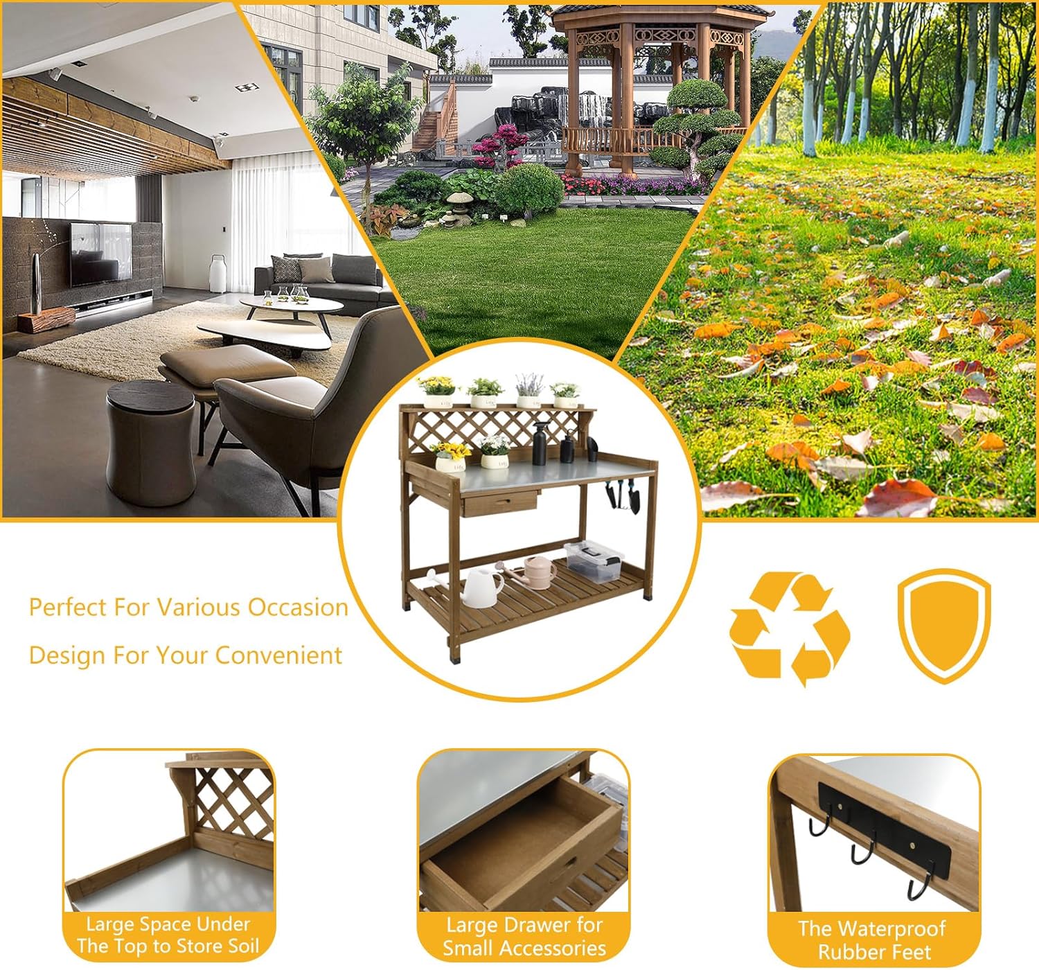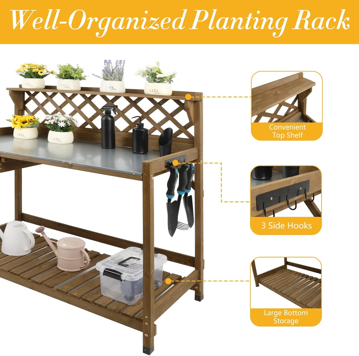 - 【THOUGHTFUL DESIGN】Enhance Your Gardening With This Versatile Potting Table Featuring A Top Shelf For Plants And Tools. Raised Edges Prevent Items From Falling, While Three Side Hooks Keep Tools Within Easy Reach. The Waterproof Rubber Feet Protect Surfaces And Prevent Damage From Ground Moisture.