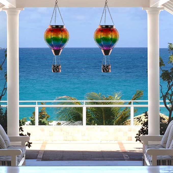 - Hot Air Balloon Solar Lantern: The solar lanterns outdoor waterproof has a unique design that incorporates the classic elements of a hot air balloon. Its shape resembles a hot air balloon floating in the air, with a candlestick hanging below. Coupled with the flickering flame design and rainbow-like colorful gradient colors, the outdoor lantern is full of dreamy atmosphere, creating a warm and romantic atmosphere for your garden