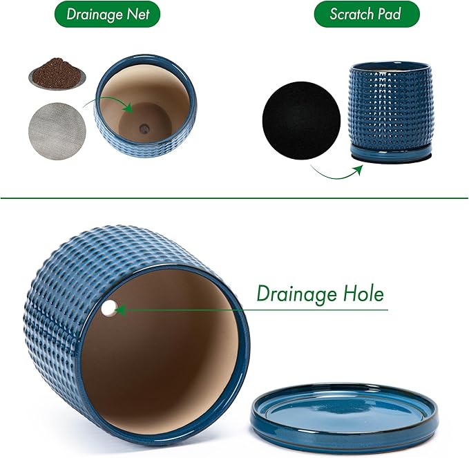 D'vine Dev 6 Inch Ceramic Beaded Stoneware Planter Pot - Flower Pot with Drainage Holes and Saucers for Indoor Succulent Plants or Flowers, Midnight Blue, 27-C-X-3