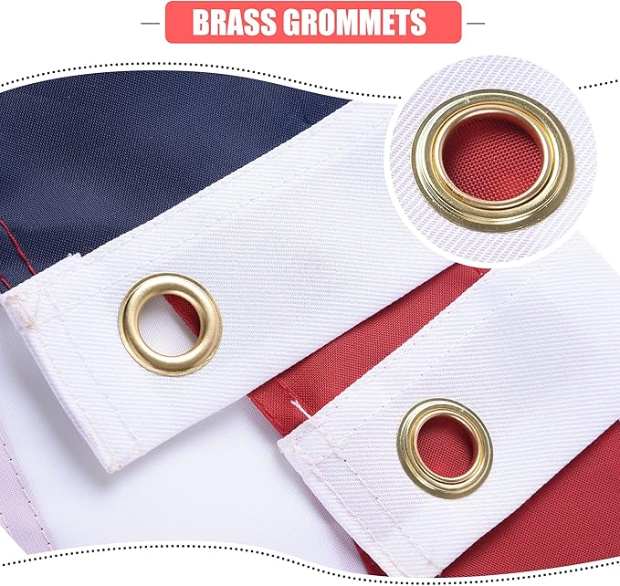 - Strong, Durable: The USA flags 12x18 outdoor, four point needle fly hem (4 rows of stitching), brass grommets. Fly your big united states flags proudly in the rain, snow, high winds, and sunshine! The perfect all-weather, outdoor American Flag banners.
