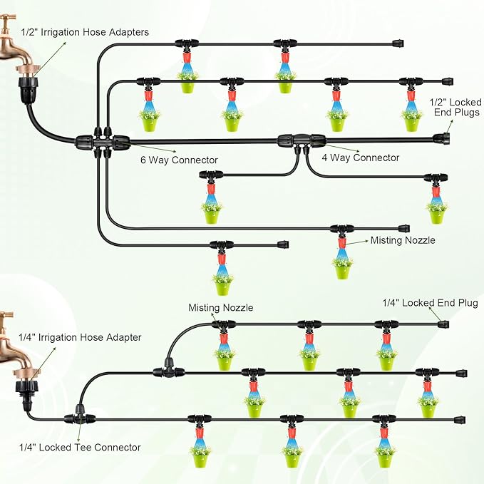 - Complete Irrigation Set: this drip irrigation fittings kit includes 2 pcs 6 way connectors, 2 pcs 4 way connectors, 10 pcs 1/4" locked tee connectors, 10 pcs misting nozzles, 2 pcs 1/4" irrigation hose adapters, 2 pcs 1/4" locked end plugs, 4 pcs 1/2" irrigation hose adapters, and 4 pcs 1/2" locked end plugs; It provides all the necessary components to meet your irrigation needs and create a customized drip irrigation system, a great starter kit for your garden