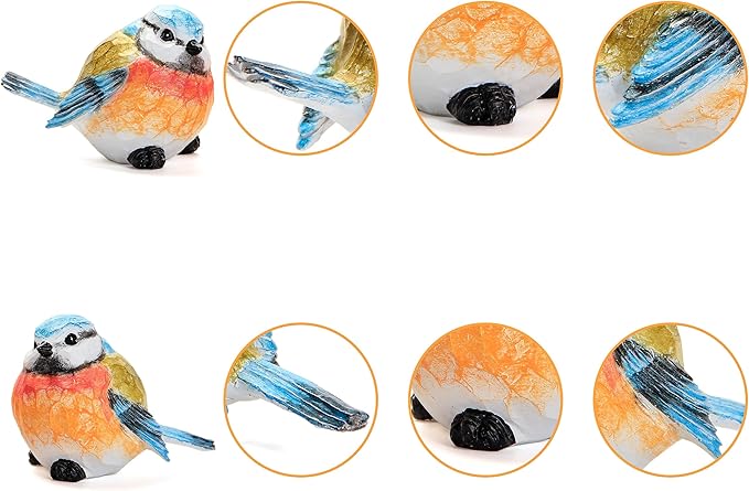 - Measurement & Material:The item is including 2 pieces of bird statues,each size is about 3.9”x2.5”x2.9”&0.2LB.They look similar but not identical.They are chubby and adorable,carved with bright shades of orange,yellow and blue.It can be place in garden and will not tip over easily.