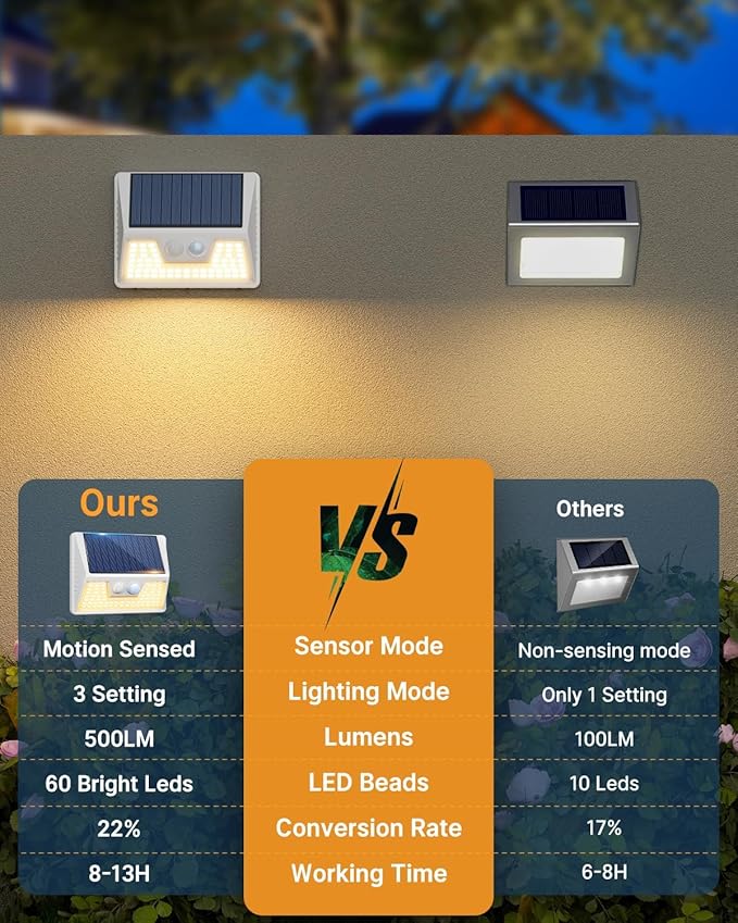 - 【Faster Charging-Longer Illumination】:This solar motion activated light boasts a supercharged solar panel with a 20-22% conversion rate, meaning it charges up quicker during the day. That translates to longer illumination at night, keeping your outdoor space brightly lit for enhanced safety and security