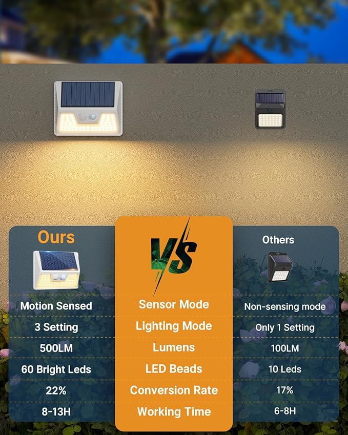 - 【Faster Charging-Longer Illumination】:This solar motion activated security light boasts a supercharged solar panel with a 20-22% conversion rate, meaning it charges up quicker during the day. That translates to longer illumination at night, keeping your outdoor space brightly lit for enhanced safety and security