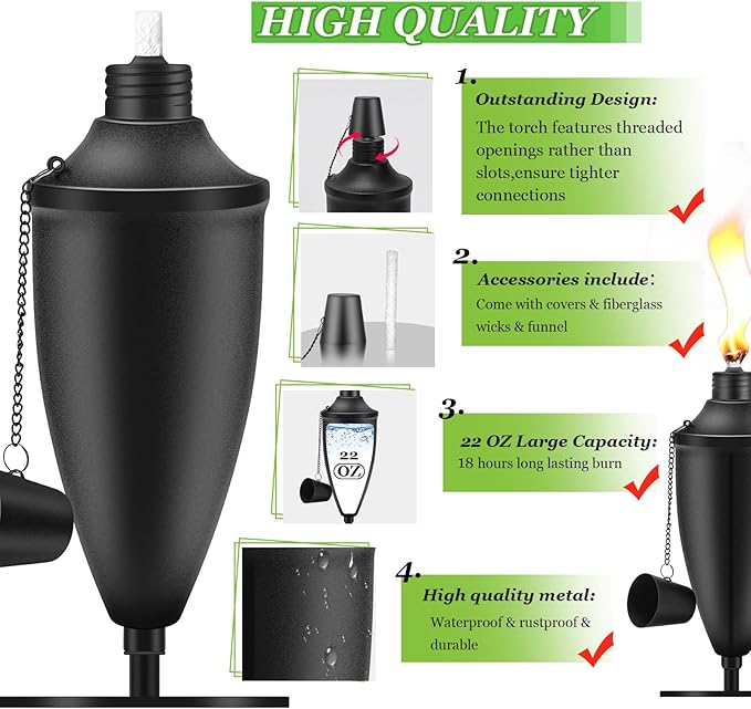 - ✿Outstanding Design: The torch features threaded openings rather than slots, ensuring a tighter connection and minimizing concerns about tipping. With its wide mouth design, it allows for easy refilling and minimizes waste to the fullest extent.