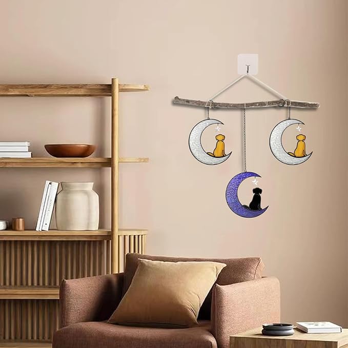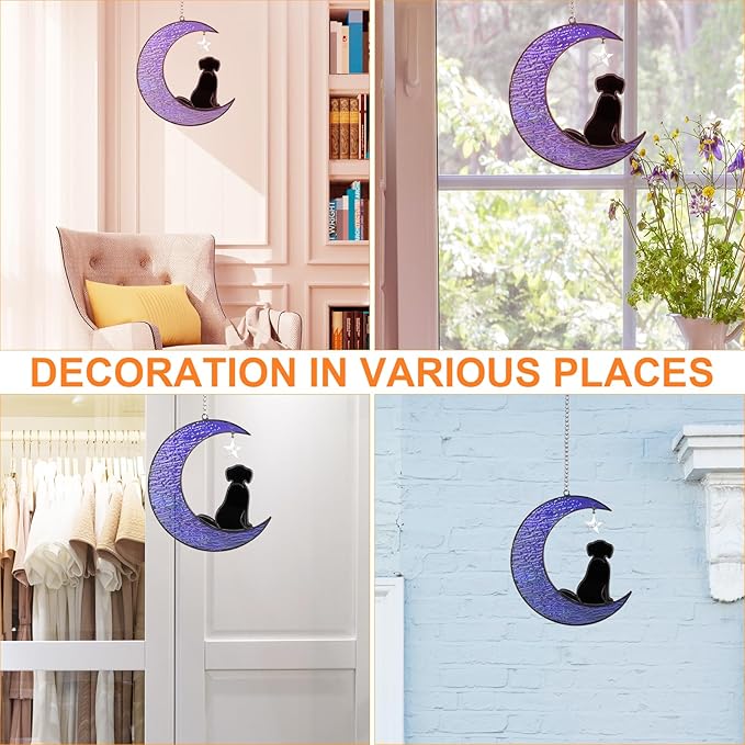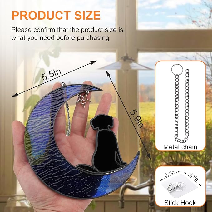 - 🐾【Easy To Hang Pet Memorial Suncatcher】Each stained glass window hangings dog grief gift will be packed in a box, included iron chain and sticky hooks. Dog bereavement gifts size:5.5''x5.9'', 1.2" sticky hooks.You can indoor window hanging for bedroom, bathroom, kitchen, cafe, office, classroom, porch, balcony, etc.