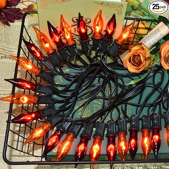 - 🔥【Widely Application Halloween Outdoor String Lights】Our purple orange Halloween lights fits C7/ E12 base and widely application for Christmas Halloween tree lights, Halloween fireplace decor fake fireplace lights, Halloween party lights, Halloween home decor lights, Halloween haunted house decorations, birthday decor, weeding decor lights and more, create a relaxing and cozy atmosphere.