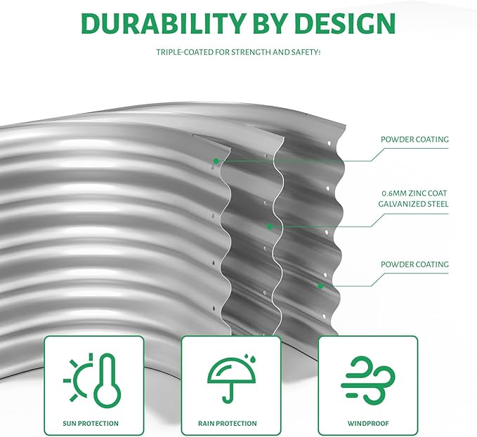 - 【Quality Material 】Durably made of Wave alloy steel with Zinc-Aluminum coating, garden bed is 5 times more durable than plastic planter box or wood raised garden bed. Extra thick 0.7mm corner steel panel make this oval raised garden bed solid and sturdy last for more than 20 years.