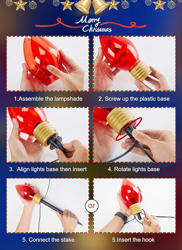 - Replaceable: Turn the yard Christmas lights support on the base and pull out the internal C7 light bulb from the outer jumbo c9 bulb, screw out the damaged bulb from the bulb holder, then screw in a new one gently. And turning off one light will not cause the other lights to go out, which is very user-friendly. These light strings are extremely durable and have an average life of 5,000 hours