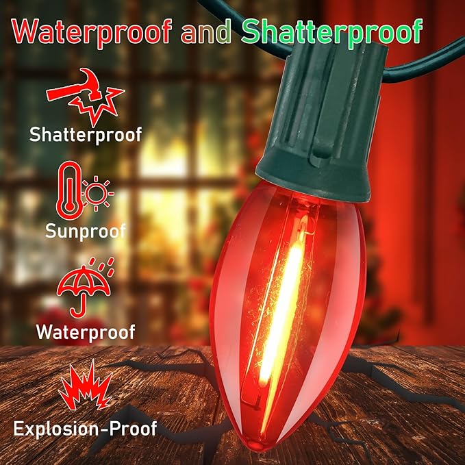 - 【Quick and Safe Setup】Installation is quick and simple with end-to-end connectors allowing you to link up to 28 sets. These UL-certified c9 christmas lights are safe to touch and maintain brightness even if one bulb goes out. Featuring a 6" lead, 12" spacing between bulbs, and a 6" tail, you can confidently set up your lights knowing they meet the highest safety standards.