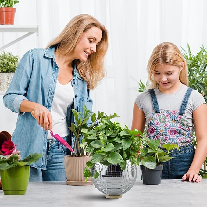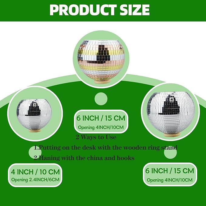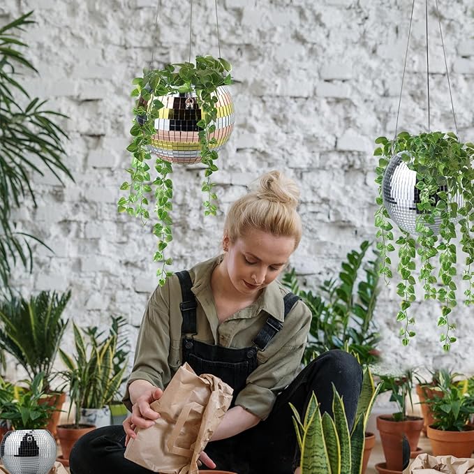 - Decorative Planter: This hanging planter set features a 4"/6" disco ball design with a silver rainbow finish, perfect for adding a touch of whimsy to your home decor.With the reflective mirror disco design, the hanging planter reflects light from every angle, casting shimmering patterns and creating a dynamic, disco-inspired ambiance in your space