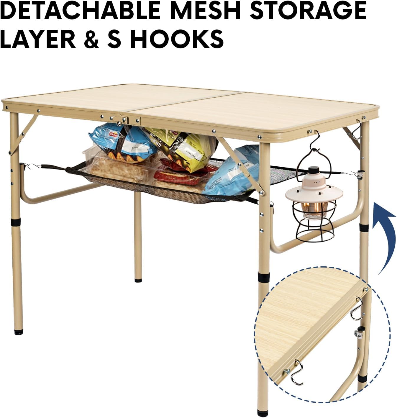 - Extra Storage Space: The portable camping table with mesh storage tier and S hooks provides more space. When camping, you can put some small kitchen tools, snacks, flashlights on the mesh tier. The S hooks can to be hanged speakers, equipment,etc