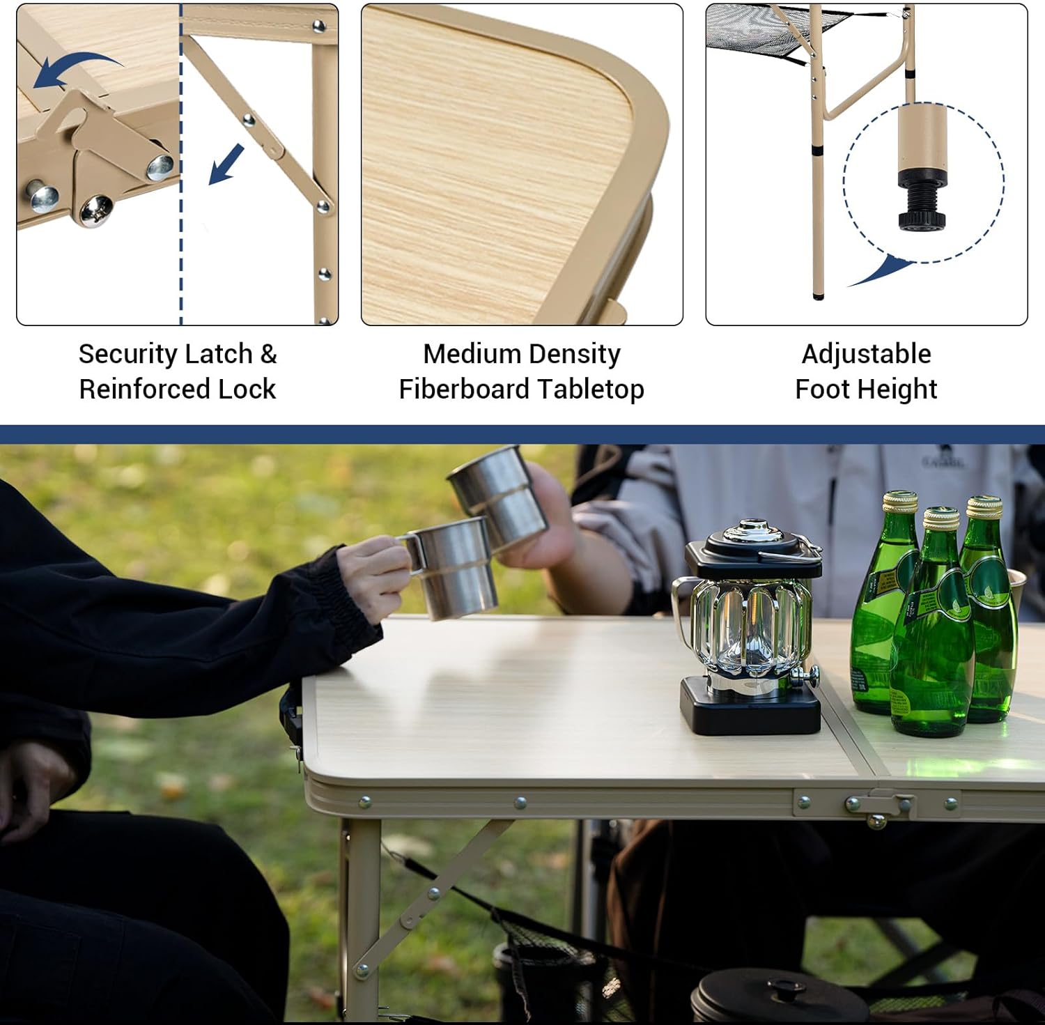 - 2 Height Adjustable: The camping table can be adjusted to 2 different heights, suitable for a variety of needs. If the ground underneath the camp table is uneven, simply adjust the table legs to stabilize it