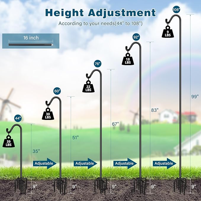 - 【HIGH QUALITY & ADJUSTABLE】 The height of the shepards hooks for outdoor is 108 inch and the diameter is 5/8 inch. Our garden hook is made of high quality iron, the black coating on the surface is rust resistant. The height of the shepherds hook for bird feeder can be adjusted by adding or reducing the pole sections, each pole section is 16 inch. So you can adjust the height to 92 inch, 76 inch, 60 inch and 44 inch.