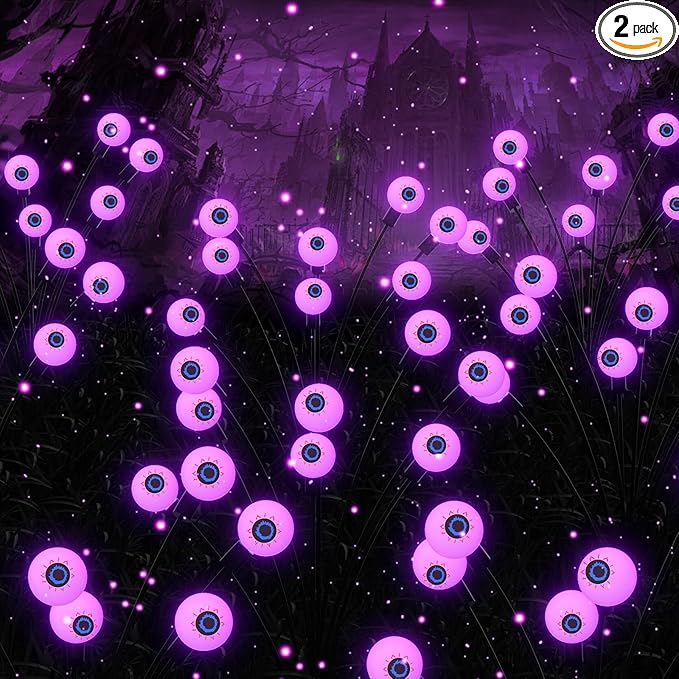 - 【Vivid & Scary Solar Halloween Lights】2-Pack Halloween solar pathway lights, each set with 8 bloodshot eyes, realistic and terrifying, built-in bright eerie lights, give spooky purple glow, these creepy lights add a spooky touch to your Halloween outdoor decor.