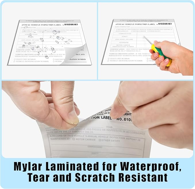 - Label Durability: The durable white 2-ply vinly vehicle inspection labels with mylar lamination offer resistance to heat, tear, and puncture. These annual vehicle inspection stickers are easy to apply, write on, and long-lasting. Measuring 5" x 4", they are sequentially numbered for convenient alignment with inspection forms.