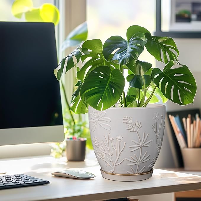 • Stylish Appearance: Our ceramic planter has a white main colour, a beautiful embossed petal and leaf pattern on the surface, elegant appearance making it ideal for home decor, garden decor and office decor