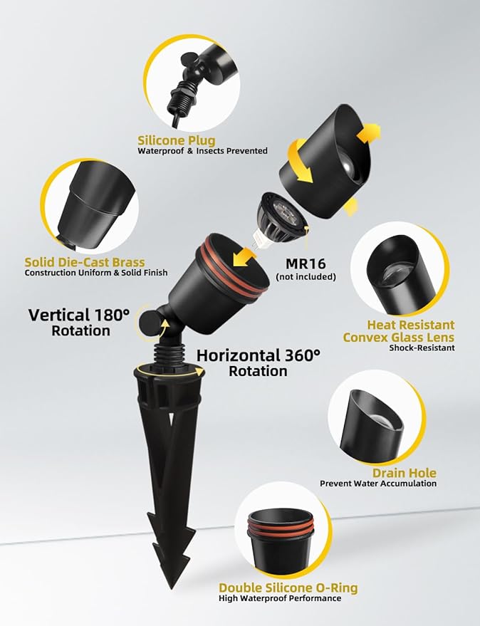 - FLEXIBLE INSTALLATION: Our low voltage up lights outdoor features a cleated heavy-duty stake design, making it easy to mount on the ground. Additionally, there is a screw for adjustment in the middle of the spotlight, allowing you to rotate the outdoor spotlights for yard up to 180ยฐ in the vertical direction. These Brass landscaping lights offer a 360ยฐ horizontal rotation by adjusting the ground stake. Allows you to illuminate any angle you want without even moving the fixture.