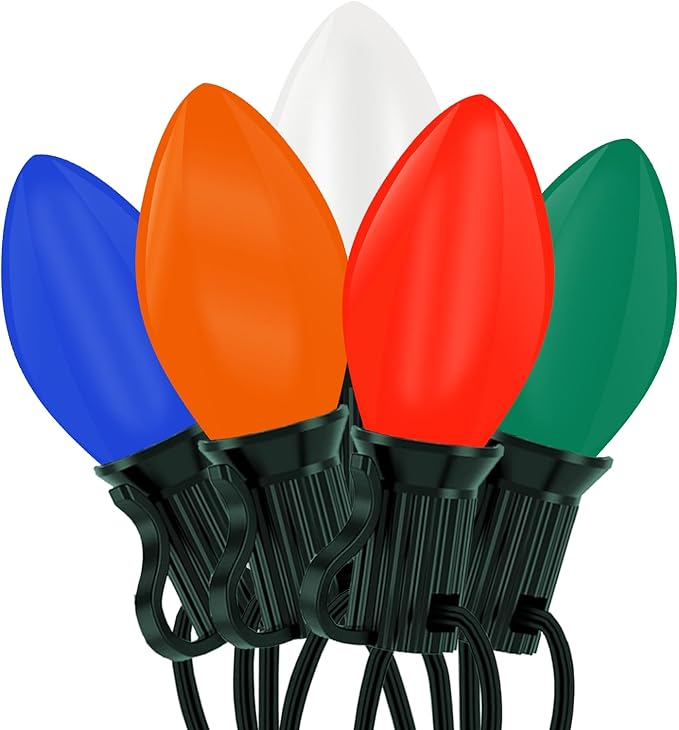- Classic Christmas Colorful Bulbs: Featuring a mix of red, blue, green, white, and orange bulbs, Each bulbs 5W, C7/E12 Candelabra Base,125W per string,120V Power, Christmas lights are UL Listed for indoor and outdoor use, christmas decorations string lights bring a timeless, cheerful holiday look that enhances the festive spirit in any space.