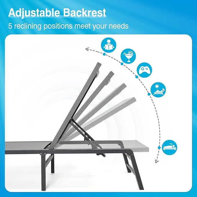 - 【5 Adjustable Positions Chaise Lounge】The FHVIT outdoor chaise lounge offers 5 adjustable backrest positions, perfect for any activity in all seasons—whether you're lying flat for a nap, sunbathing, playing games, enjoying a drink, or reading. Easily adjust the angle to suit your relaxation needs