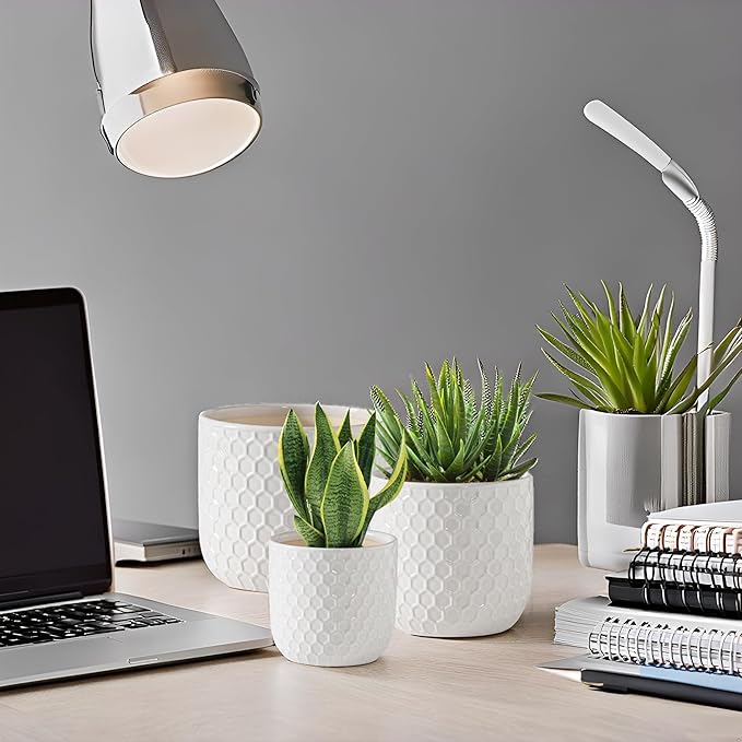 Docrin Plant Pots Indoor with Drainage: 6.4+5.3+4 Inch Ceramic Flower Pots for Plants - Set of 3 Modern Decorative Planters for House/Office/Gift - White Honeycomb