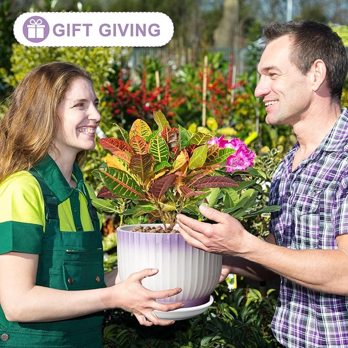 8 Inch Plant Pot, Ceramic Planter with Drainage and Saucer, Ceramic Pots for Plants, Indoor Plant pots,Ceramic Flower pots(Purple + White, Plants NOT Included)