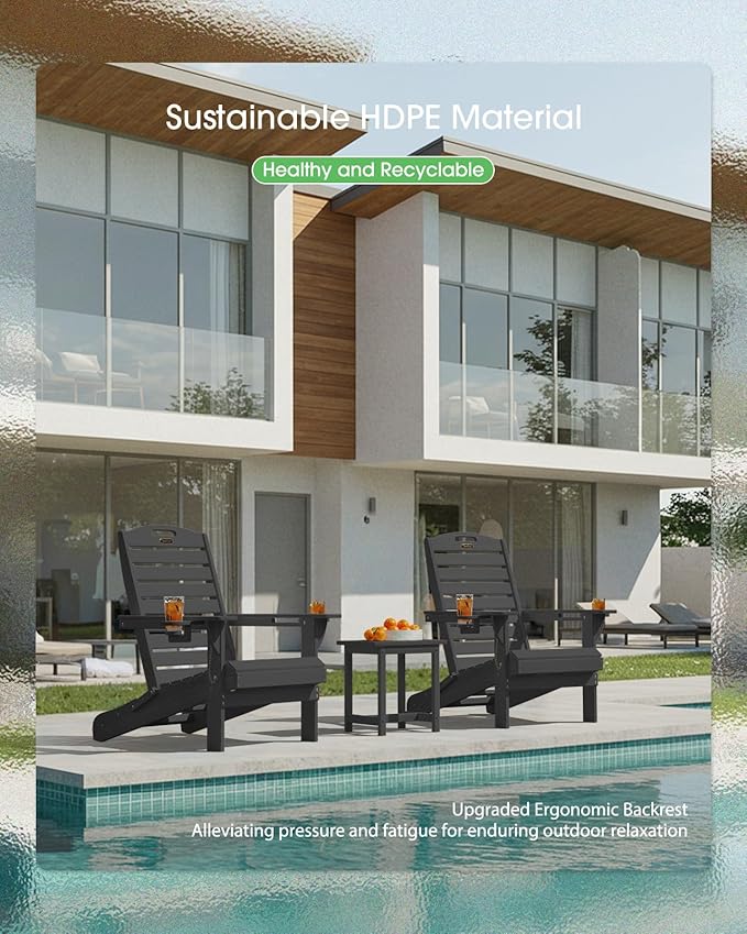Folding Adirondack Chair HDPE All-Weather Adirondack Chairs with Cup Holder, Outdoor Fire Pit Chairs Lawn Chair for Deck Patio Garden (Black)