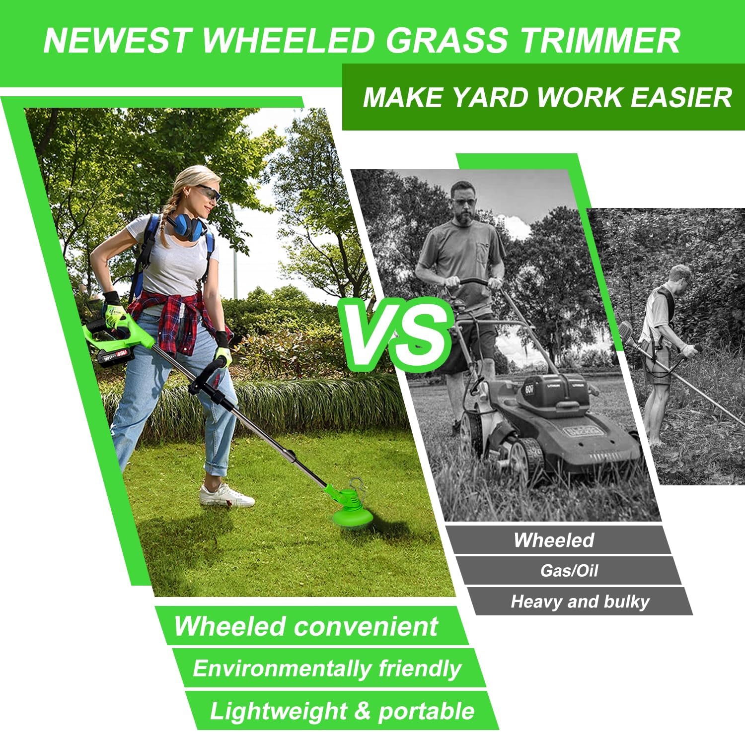 - [Foldable, adjustable length] The battery weeder weighs just 4.8 pounds and is suitable for women and the elderly. The length of our lawn trimmers can be adjusted (up to 50 inches) to suit a variety of user groups. In addition, we have a wheel that is simple to use and makes mowing work safer and more comfortable. The foldable design makes storage easier, whether at home or in the car, taking up less space.