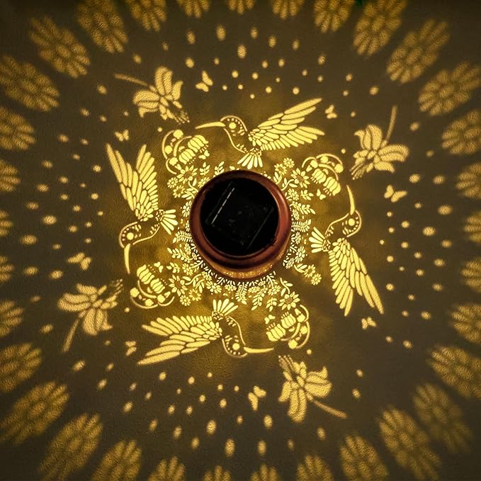 - 【Perfect Garden Decorative】- Hummingbird solar lanterns adopts hollow out design and hummingbird pattern. Solar lanterns could project beautiful patterns, creating a gorgeous and warm atmosphere. Perfect for decorations for garden,patio,lawn,backyards,porch,pathway, walkway,balcony,tree and many other scenes. When lit at night, adding a touch of color to your garden.Size: 7"H x 4.5"W x 4.5"L