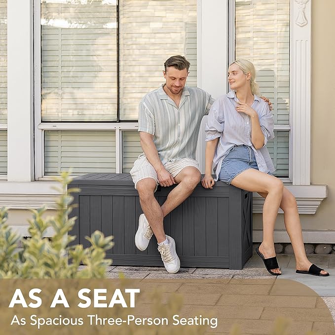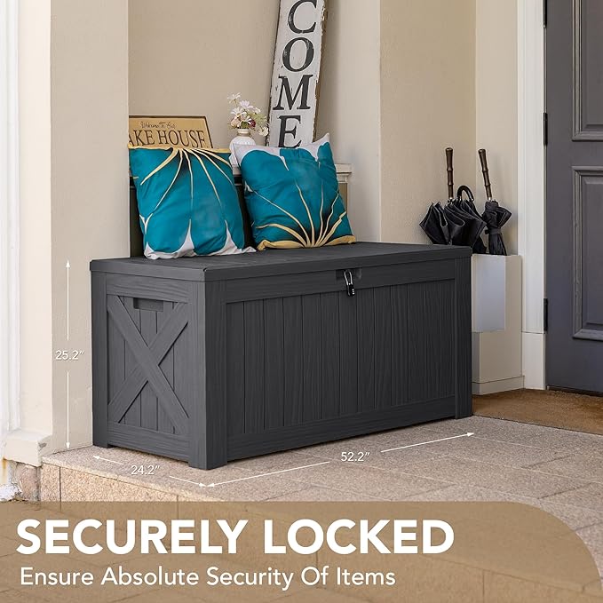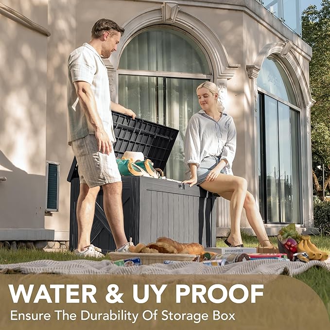 - High-quality Resin: The deck storage box is made of water-resistant resin, complemented by a wood like grain design that maintains a fresh look even with all-weather use