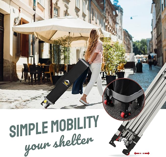- STOโ N GO SYSTEM - Our lift-free storage and transport system makes it easy to collapse the canopy, cover it with the bag, and roll it away. The canopy can be stored with the fabric attached, with a specialized pocket for 8 stakes and 4 guy ropes. Integrated wheels in the feet allow easy movement even when the canopy is set up, by simply lifting the side without wheels. This feature is especially useful for quick setup and takedown at locations like the beach, park, or sports events.