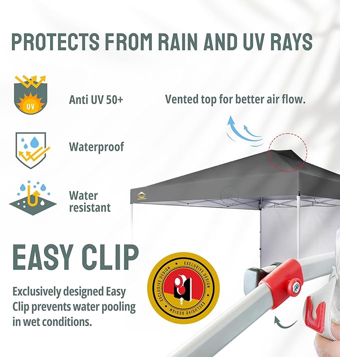 - EZ CLIP CANOPY FABRIC - The newly designed clip system makes it easy to attach the canopy fabric to the frame. The silver-coated interior provides exceptional UPF 50+ UV protection, ensuring cooler, safer shade. Made from rugged 150D fabric, the canopy is water-resistant and CPAI-84-rated for flame resistance. The canopy features integrated air vents, and the EZ clip system prevents wind lift and rain pooling, reducing fabric tearing risks. Ideal for outdoor events, weddings, and gatherings.