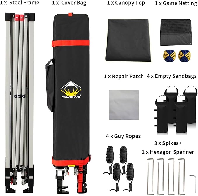 CROWN SHADES 10x10 Pop Up Canopy Tent with Game Netting - Beach Tent with One Push Setup - Outdoor Sun Shade for Events, Parties, Camping with STO-N-Go Cover Bag, Silver Coated Top, Black