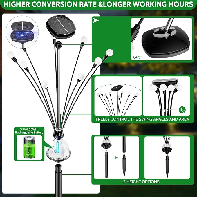 - Unique design: Our solar garden lights have 9 larger and brighter LED premium firefly bulbs, besides the 9 firefly bulbs, there is an illuminating LED light at the bottom which is composed with 6 LED bulbs with warm white lighting to illuminate the pathway. The solar panel is on the top of the lights, which can be rotated in 360ยฐ and adjustable to aim at the sky for maximum sunlight absorption.