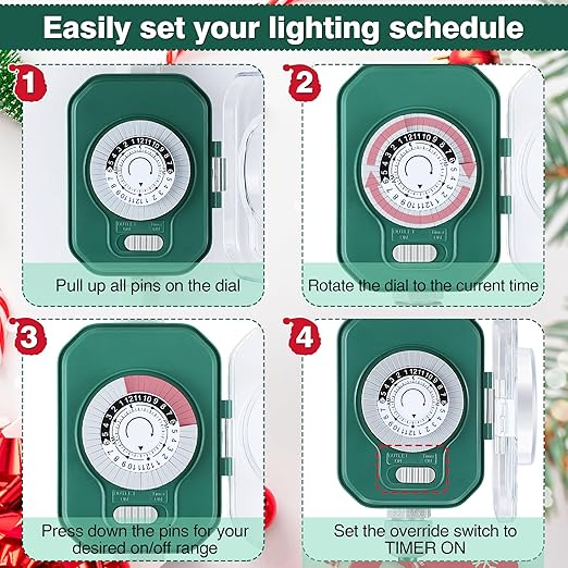 - Programmable Mechanical Timer: The built in mechanical timer is programmable in 30 minute intervals with 48 setting options over a 24 hour period, allowing you to customize your power schedule with ease. To set, rotate the dial until the pointer aligns with the current time, press down or pull up the pins for the desired on/off period, and switch to TIMER ON. The timer repeats the schedule daily, eliminating the need for manual operation