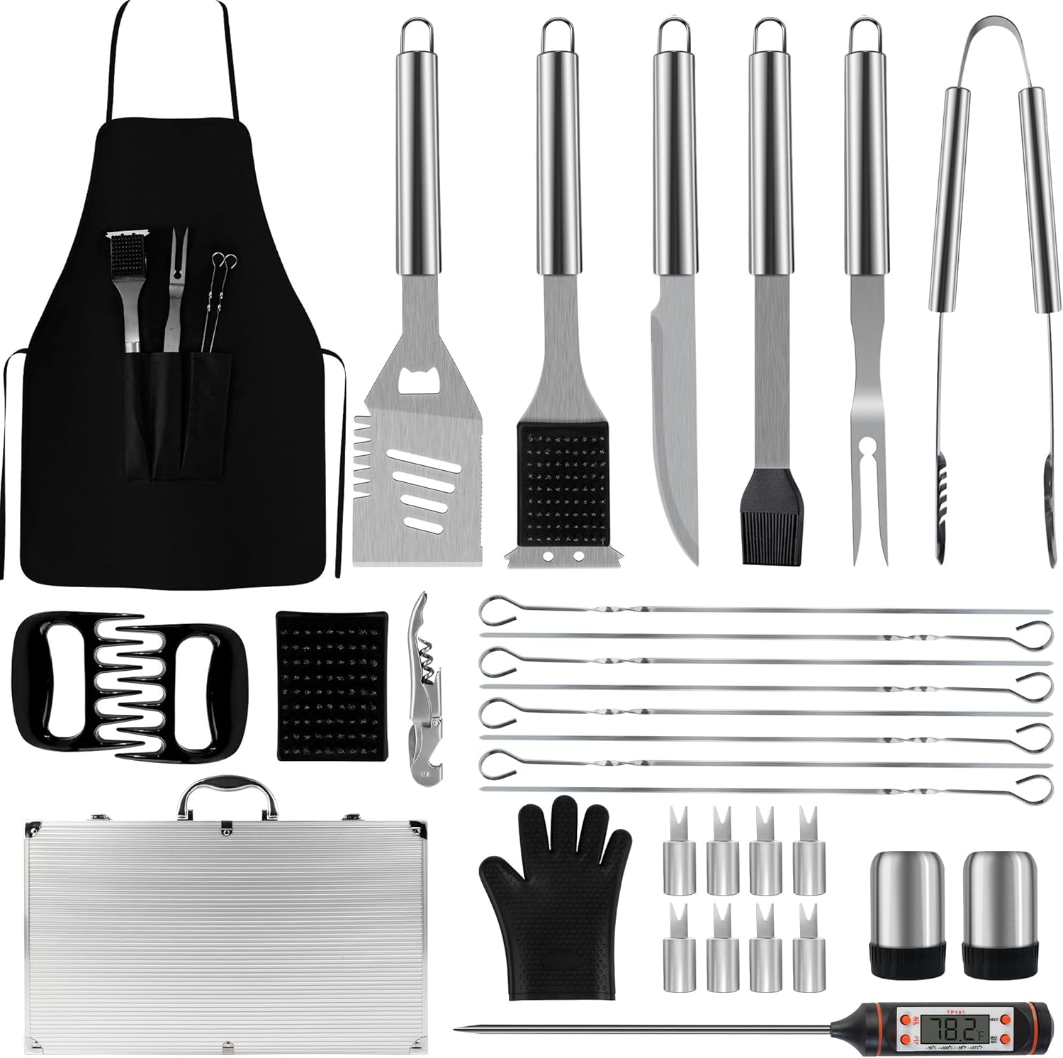 - COMPLETE GRILLING ACCESSORIES: Our 32-Piece BBQ Tool Set includes essential grill accessories like apron, tongs, basting brush, 4-in-1 spatula, cleaning brush, fork, knife, meat thermometer, heat-resistant gloves, bottle opener, salt and pepper shakers, meat claws, corn holders, and skewersโall neatly packed in a handy carrying case, ensuring you're fully equipped for backyard barbecues or camping trips