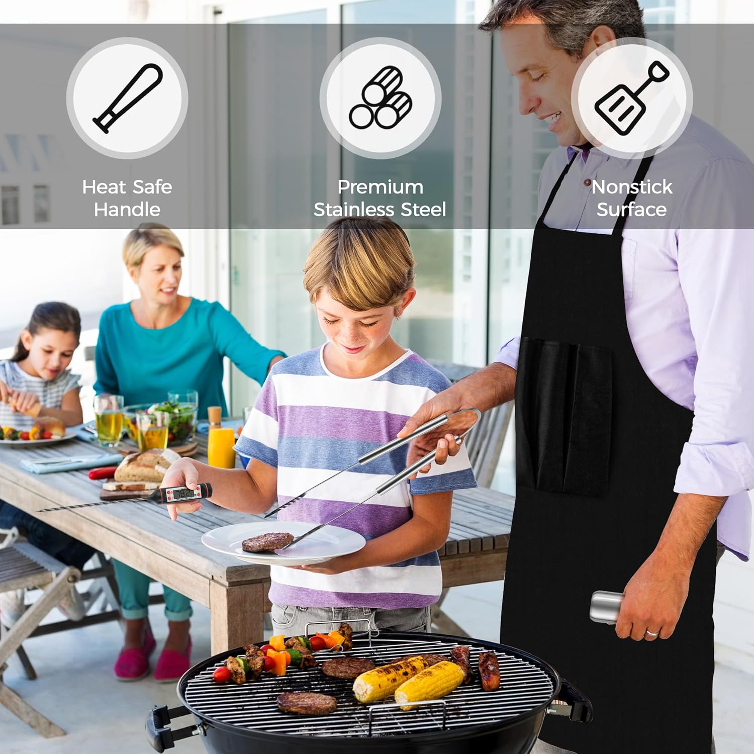- Included Components : 4-in-1 Spatula, Meat Thermometer, Carry Case, Apron, Tongs, Basting Brush, Fork, Knife, Heat Protective Glove, Bottle Opener, Grill Cleaning Brush, Replacement Head of Cleaning Brush, Salt&Pepper Shakers, Meat Claws, Corn Holders, Kabob Skewers 4-in-1 Spatula, Meat Thermometer, Carry Case, Apron, Tongs, Basting Brush, Fork, Knife, Heat Protective Glove, Bottle Opener, Grill Cleaning Brush, Replacement Head oโฆ See more