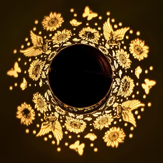 - Stylish Pattern Design: Our outdoor solar lanterns feature stylish and beautiful hummingbird and sunflower patterns. Whether you hang the lantern on a tree or place it on a flat surface, it will cast charming patterns around. The unique patterns bring a breath of nature to your outdoor space, making it more inviting and visually appealing.There is the switch ON/OFF on the lantern cover, please make sure to Press the Button before charging.